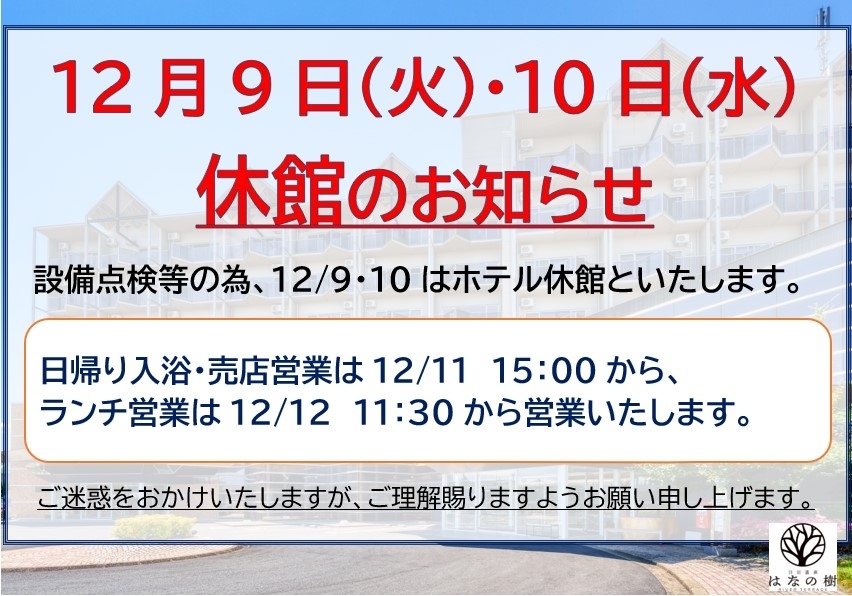 設備点検等のため12/9 (火) と 12/10 (水) は